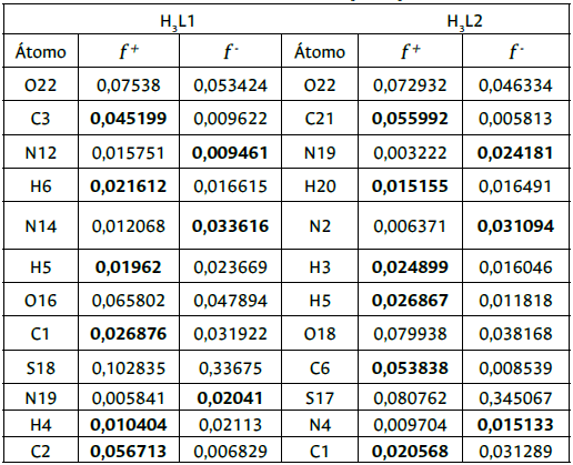 Tabla 1: Valores para la función de Fukui para un ataque nucleofílico (f+) y electro-fílico (f-) de los compuestos H3L1 y H3L2.