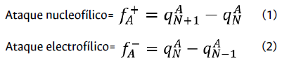 Para determinar la distribución de los sitios activos de la molécula se utilizó Ec. (1), y Ec. (2) para calcular los valores de la función de Fukui para un ataque nucleofílico y electrofílico: