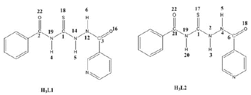 Os compostos N-(2-nicotinoilhidrazina-1-carbonotioil)benzamida (H3L1) e seu isòmero N-(2-isonicotinoilhidrazina-1-carbonotioil)benzamida foram sintetizados. (H3L2) doadores tipo N, S, O, por reação de isotiocianato de benzoíla com hidrazida nicotínica e isoniazida, respectivamente. Os compostos H3L1 e H3L2 foram caracterizados por 1H-NMR, 13C-NMR, FT-IR e análise elementar. A análise computacional usando as funções de Fukui foi realizada para determinar as razões pelas quais os 1,2,4-triazóis não foram formados. Testes preliminares dos compostos sintetizados foram realizados contra Staphylococcus aureus (Gram+) e Escherichia coli (Gram-), tendo demonstrado atividade significativa contra as referidas bactérias.