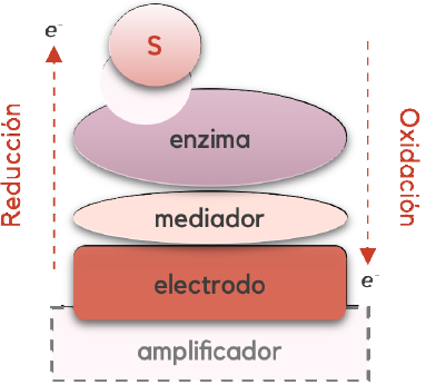 Figura 5: Diseño básico de un biosensor con mediador para el flujo electrónico. Las flechas indican la dirección del flujo de electrones en la catálisis enzimática. S corresponde al sustrato.