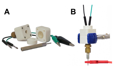 Figura 6: Microcelda de 100 gLimpresa en el laboratorio. (A) electrodo de BDD, electrodo de referencia de Ag/AgCl y electrodo auxiliar de platino. (B) Microcelda ensamblada para mediciones con un electrodo BDD. Figura tomada de la referencia [116].