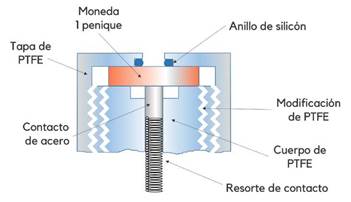 Figura 7: Diagrama de la sección transversal de la celda ensamblada de PTFE con un electrodo de un penique. Imagen adaptada de la referencia [125].