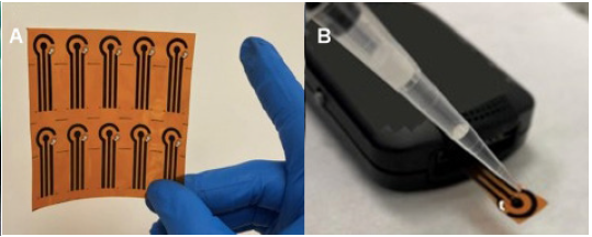 Figura 9: Sensores fabricados a partir de electrodos carbonizados con láser. (A) Fotografía de un conjunto de sensores sobre el sustrato de poliimida. (B) Prueba de fentanilo con el sensor. Imagen adaptada de la referencia [138].