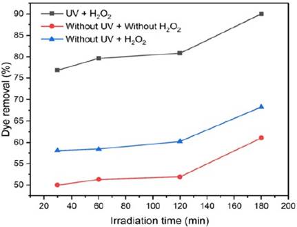 MB degradation in this research was done using composite chito-san-Fe2O3 (1:1). This chitosan-Fe2O3 composite (1:1) was used because the characterization is the best result from the three composite generated materials. According to Zhang et al., as the band gap energy is smaller in semiconductors, they can capture more photons for adsorption, so the theory will give the best result for chitosan-Fe2O3 composite on degradation of MB [34]. The effect of irradiation time on the decrease in MB concentration at a dye of 5 ppm is shown in figure 4. It shows that the highest and lowest percentage of decrease in MB concentration was achieved at an irradiation time of 180 and 30 min by 90.00 and 76.84% (gray line). Observations with a similar trend have been reported by Fassi et al. in a comparative study on the photodegradation of bromocresol green using Fe(II)/H2O2 and UV [35]. This condition shows that the degradation time is directly related to the contact between the photon rays and the chitosan-Fe2O3 composite, leading to a greater decrease in MB concentration. The presence of H2O2 acts as a reactant capable of producing hydroxyl radicals («OH) which can degrade MB more effectively [12].