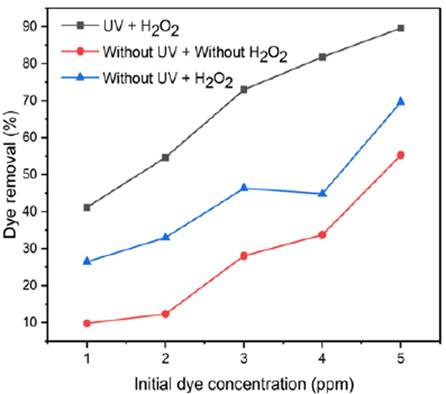 Based on figure 5, the initial MB concentration of 5 ppm shows equilibrium with the adsorption and photodegradation processes without H2O2 of 55.28% and 69.60%, respectively. A significant difference in the percentage of decrease was observed with the addition of H2O2. The photodegradation process is higher than the adsorption because the UV light used has a role in producing «OH radicals, which can degrade MB. Without UV irradiation, the dye can only undergo the adsorption process [39]. Therefore, the effectiveness of photodegradation will increase with the addition of H2O2 to produce «OH radicals. In conclusion, the addition of H2O2 can affect the effectiveness of photodegradation under the influence of the initial MB concentration. This is based on the photo-Fenton process, there are two reactions, namely Fenton and photocatalysis, where both reactions produce «OH radicals.