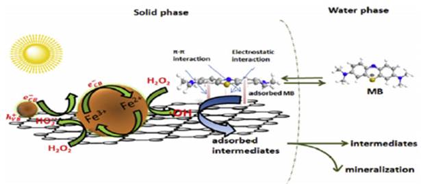 Several methods, such as adsorption, biodegradation, and advanced oxidation process (AOP), have been studied extensively to reduce dye waste [8]. Among numerous treatment techniques of large-scale industrial wastewater containing persistent organics, the adsorption method is exceptional due to simple operations, low cost, and little secondary pollutions [9]. In recent years, several techniques are investigated to remove organic contaminants for wastewater remediation among which photocatalysis showed large opportunities due to the low energy consumption, complete decomposition of organic pollutants, and high stability [10,11]. AOP methods, such as photo-Fenton, have attracted attention because they show excellent ability and activity in reducing dye concentration. Additionally, this method can degrade harmful compounds through an oxidation process with the help of Fenton reagent in the form of hydrogen peroxide and ultraviolet light [12]. The photo-Fenton process combines hydrogen peroxide and a catalyst to produce «OH radicals that decompose MB dye into molecules, such as CO2, and water [13]. The transformation reaction takes place on the semiconductor material induced by ultraviolet light. The types often used for this process are iron semiconductors derived from the oxide, sulfide, carbide, and composite groups [14].