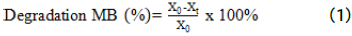 Control studies involving the degradation of MB without UV irradiation and without adding H2O2 (comparator I, red line) and without UV irradiation but adding H2O2 (comparator II, blue line) were carried out. Based on figure 4, the adsorption process without H2O2 (red line) showed the lowest percentage of decrease in MB concentration as compared to the UV irradiation process with H2O2 (blue line). The comparator I showed a degradation of 61.07%, while the comparator II was 68.26%. The difference between comparator II and photodegradation in the presence of H2O2 was 21.74%. This indicates that the addition of H2O2 greatly affects the MB degradation process.