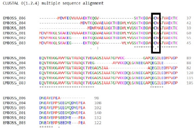 Figura 1: Alineamiento de seis secuencias de diferentes especies para la proteína SNCA, descargadas de la base de datos del NCBI y alineadas con la herramienta Clustal Omega. Los aminoácidos resaltados en el recuadro muestran la posición 51, en donde en humanos (EMBOSS-001) se encuentra glicina (G) y en otras especies se encuentra aspartato (D). El asterisco (*) indica que en dicha posición los residuos son 100% idénticos; los dos puntos (:) indican posiciones en las que se han realizado sustituciones conservativas; y el punto (.) indica sustituciones menos conservativas.