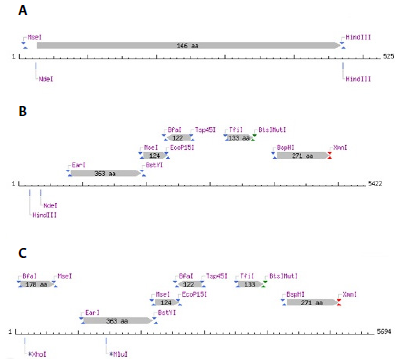 Figura 3: A: cortes calculados para la secuencia del gen SNCA G51D con tag de histidinas con enzimas de restricción NdeI e HindIII; B: cortes calculados para el vector con enzimas de restricción NdeI e HindIII; y C: cortes calculados para el vector con el inserto con enzimas de restricción Mlul Y Xhol.