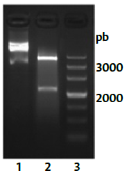 Figura 4: Electroforesis en gel de agarosa al 0,8% p/v con tinción de bromuro de etidio. Carril 1: ADN plásmido circular. Carril 2: Plásmido digerido con Xhol/Mlul. Carril 3: Marcador de tamaño de ADN.