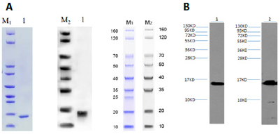 Figura 6: A: proteína 6xHis-SNCA G51D en SDS-page (izquierda) y Western blot (derecha); carril M1: marcador SDS-PAGE (kDa) y carril M2: marcador Western blot (usando anticuerpo Anti-His). B: membrana incubada con anticuerpo policlonal obtenido y diluido (1:1000); carril 1: adición 20 ng proteína 6xHis-SNCA G51D, anticuerpo conejo A, segundo anticuerpo dilución (1:5000); y carril 2: adición 20 ng proteína 6xHis-SNCA G51D, anticuerpo conejo B, segundo anticuerpo dilución (1:5000), exposición de 30 s.