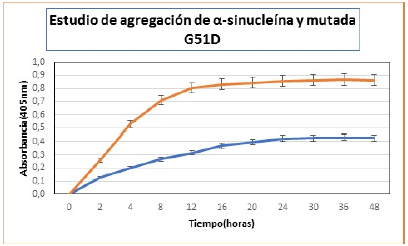 Figura 7: Estudios de agregación de SNCA silvestre (azul) y mutada G51D (naranja). Nivel de significancia