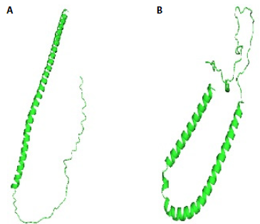 Figura 8: Modelo SNCA nativa (A) y modelo SNCA G51D mutante (B) obtenidos por el servidor Swiss-Model y visualizadas con Pymol.