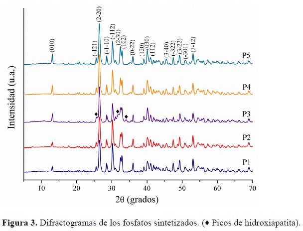 Los difractogramas mostrados en la Figura 3 muestran que todos los fosfatos sintetizados presentan la estructura de M (CaHPO4) con fase triclínica; las señales de todas las muestras corresponden al patrón del archivo JCPDS 009-0080. En todas las muestras, excepto en la muestra obtenida por procedimiento P3, sólo se observan señales de la fase M. La muestra preparada por el procedimiento P3 presenta una pequeña cantidad de fase de HA Ca10(PO4)6(OH)2 como impureza y los picos más intensos de esta fase se presentan a valores de 2θ de 26,0, 31,9 y 34,3°. No se observan picos correspondientes a las sustancias precursoras de óxido de calcio o hidróxido de calcio u otros subproductos de reacción, los subproductos de reacción de los procedimientos P1, P2 y P3 con relación Ca/P mayor que 1,0 no se pudieron determinar por esta técnica por que posiblemente están en fase amorfa o en cantidades inferiores a la sensibilidad del equipo.
