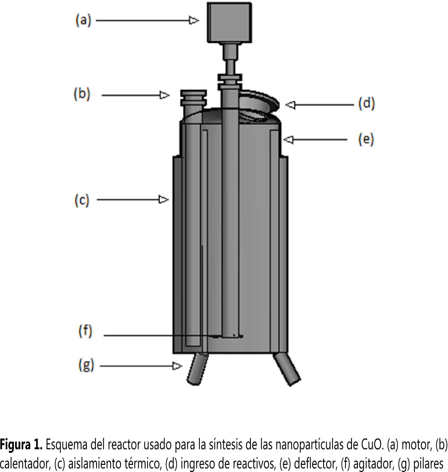 La síntesis se realizó mediante el método de precipitación ( 16 ): se preparon soluciones acuosas de 0,02 M a partir de sales precursoras de acetato de cobre monohidratado (Cu(CH3COO)2∙H2O) de grado químicamente puro, Merck Millipore, Alemania y sulfato de cobre pentahidratado (CuSO2∙5H2O) de grado técnico suministrado por la empresa J.A. Elmer, Perú. Luego cada solución de sal precursora preparada se vertió en un reactor piloto de acero inoxidable (33” de altura, 15” de diámetro, motor de 1720 revoluciones por minuto (rpm) y 0,37 kW de potencia, calentador por inmersión Rotkappe® de marca MAZURCZAK) tal como se muestra en la Figura 1. La reacción se inició en 100 °C con agitación vigorosa de 500 rpm, luego se agregó una solución de 0,1 M de hidróxido de sodio (NaOH) con 99,0% de pureza de la marca Merck Millipore, Alemania. Inmediatamente, se observó la formación de un precipitado marrón y para completar la reacción se mantuvo el sistema en agitación por 5 min. Posteriormente, el reactor fue vaciado y las NPs de CuO fueron lavadas 3 veces con agua destilada y secadas a 80 °C. Las NPs de CuO obtenidas a partir de las sales precursoras de Cu(CH3COO)2∙H2O y CuSO2∙5H2O fueron denominadas de CuO-Acet y CuO-Sulf, respectivamente.