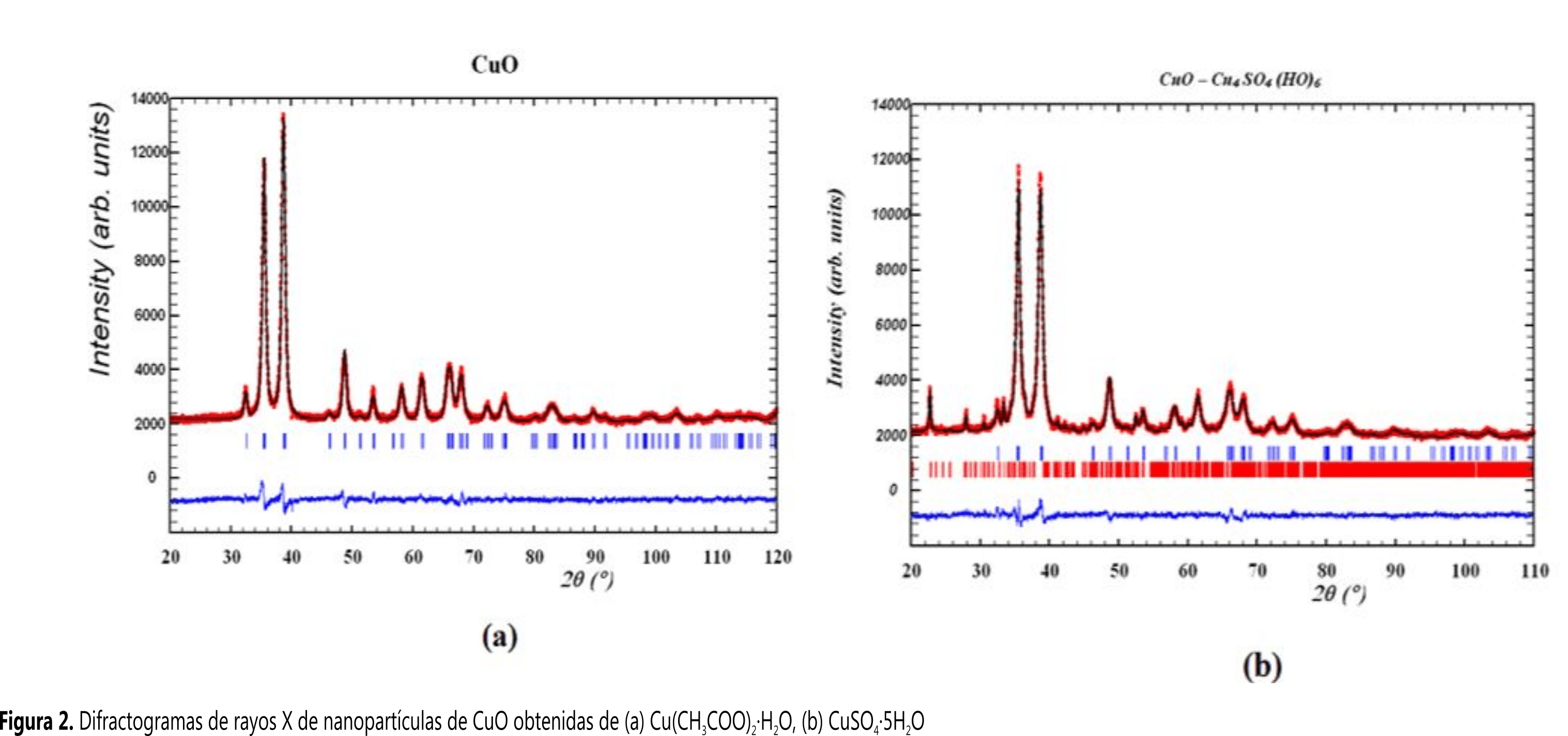 Estos picos, indexados respecto al sistema cristalino monoclínico (grupo espacial C2/c ), archivo N° 45 – 0937 de la base de datos del International Centre for Diffraction Data (ICDD, por sus siglas en inglés), son característicos de las NPs de CuO ( 8 ). La medida del tamaño del cristalito fue estimado del refinamiento de Rietveld y la fórmula de Scherrer, con valores de 15 y 19 nm para las NPs de CuO-Acet y CuO-Sulf, respectivamente.