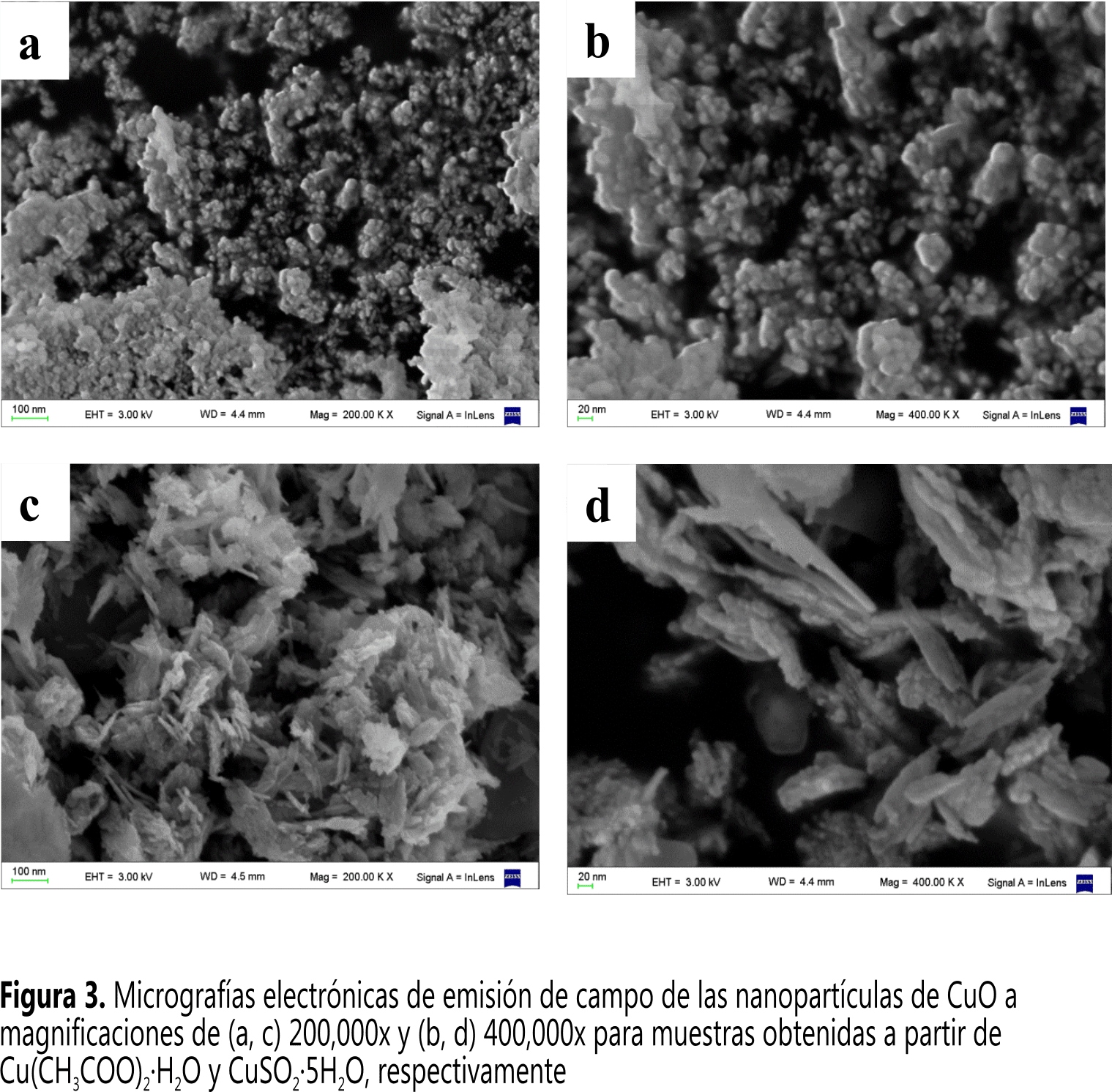 En la Figura 3 se muestra la caracterización morfológica por SEM de las NPs sintetizadas a partir de dos tipos de sales precursoras. En las Figuras 3a y 3b se muestran imágenes a baja (200 kX) y alta (400 kX) magnificación, obtenidas con electrones secundarios de las NPs de CuO-Acet, donde se observan conglomerados de partículas cristalinas de apariencia redondeada con tamaños relativamente heterogéneos que varían entre 20 y 100 nm. Las micrografías de las Figuras 3c y 3d muestran la morfología de las NPs de CuO-Sulf. Estos cristales forman conglomerados laminares, cada uno de ellos tiene partículas alargadas de varios tamaños que van entre 10 y 110 nm.