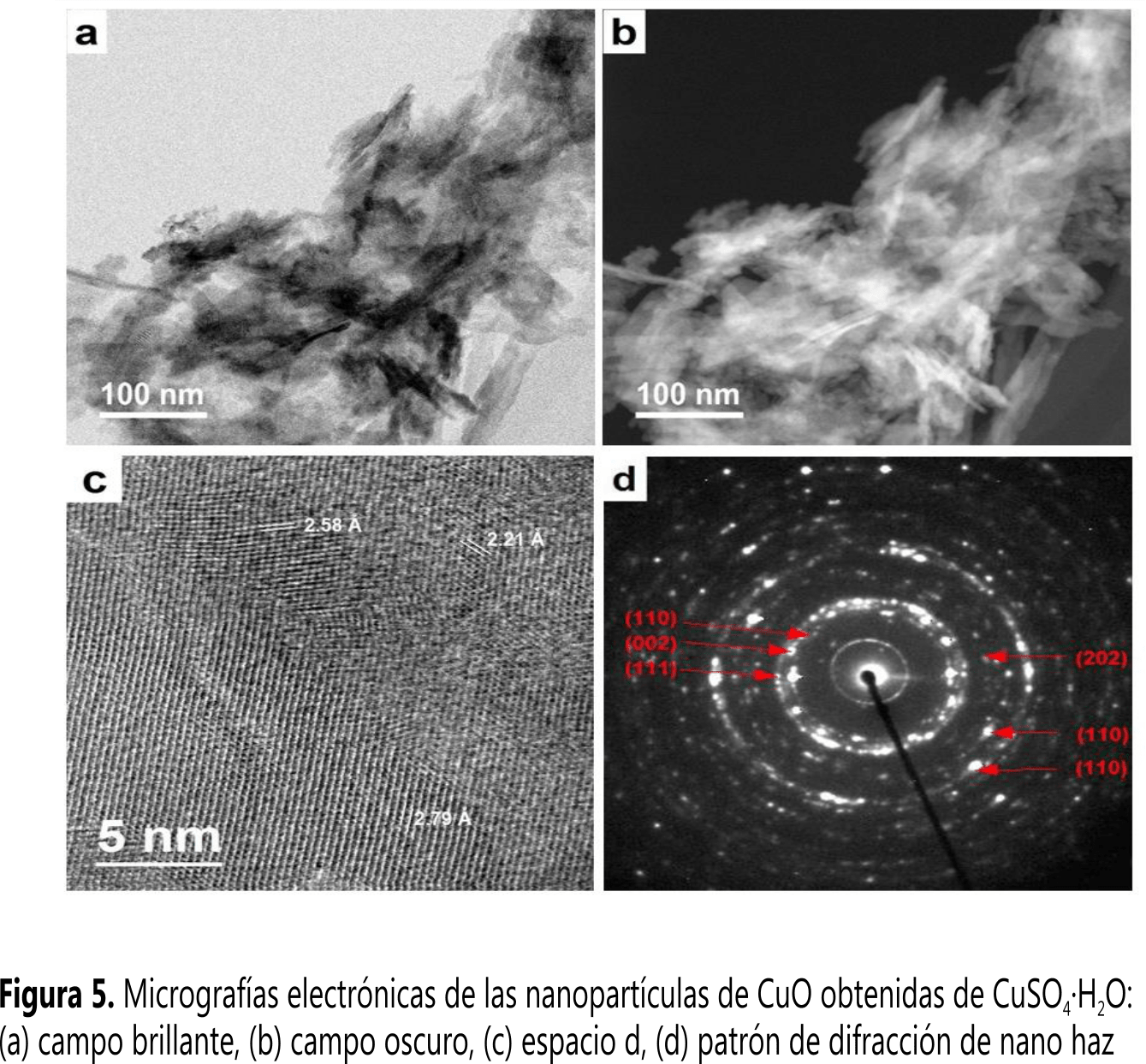 La imagen de la Figura 4c muestra a mayor magnificación la cristalinidad de las partículas. En esta imagen se ven distancias interplanares que corresponden al CuO, cuyos valores están marcados en la imagen. El patrón de difracción de electrones (Figura 4d) corrobora la cristalinidad de las partículas, cuyas intensidades indexan con CuO. Se indican los índices de Miller en la imagen. Esta información es concordante con lo encontrado por XRD.