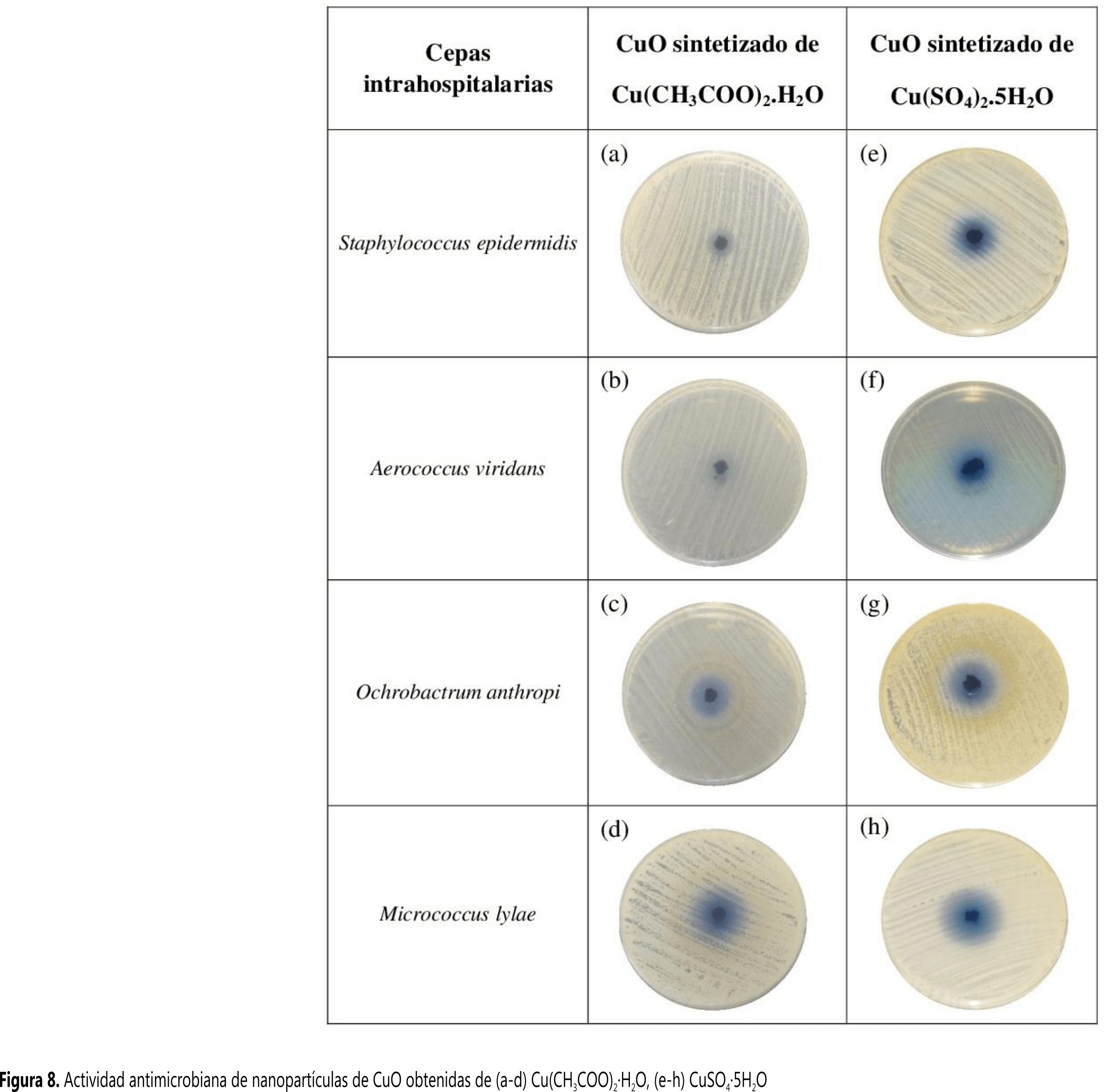 De la evaluación de la actividad antimicrobiana, se observó que los halos de inhibición para el control positivo para Staphylococcus epidermidis, Aerococcus viridans, Ochrobactrum anthropi y Micrococcus lylae fueron de 21, 18, 7 y 19 mm, respectivamente, mientras que para el control negativo fue de 6 mm para todas las bacterias estudiadas. En la Figura 8 se muestra la formación de halos de inhibición (delimitados por líneas punteadas de color rojo) para las nanopartículas de CuO-Acet para bacterias: (a) Staphylococcus epidermidis (12 mm), (b) Aerococcus viridans (10 mm), (c) Ochrobactrum anthropi (16 mm) y (d) Micrococcus lylae (14 mm). Las nanopartículas de CuO-Sulf presentaron los siguientes halos de inhibición: (e) Staphylococcus epidermidis (17 mm), (f) Aerococcus viridans (13 mm), (g) Ochrobactrum anthropi (16 mm) y (h) Micrococcus lylae (16 mm); la Tabla 2 muestra un resumen de estos datos.