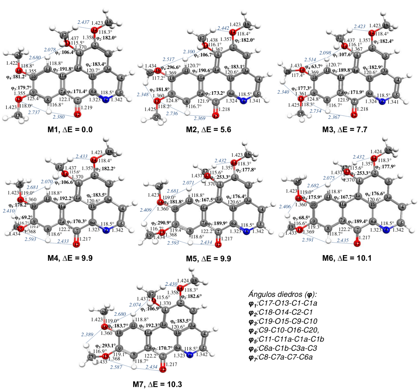 Se localizaron siete mínimos sobre la superficie de energía potencial del estado fundamental de OG. La geometría de los diferentes mínimos de OG (denominados M1 a M7), sus parámetros geométricos y la numeración de los átomos utilizada se muestran en la Figura 2. Los mínimos de OG encontrados no presentan simetría y la planaridad de sus anillos se encuentra distorsionada debido a las orientaciones espaciales de los grupos metoxilo unidos a los carbonos C1, C2, C9 y C10. Las posiciones de estos grupos establecen las diferencias principales entre un mínimo y otro. Los ángulos diedros (φ1 a φ7, ver Figura 2) describen la orientación espacial de cada grupo metoxilo y la distorsión de la planaridad de los anillos (ver Figura 3).