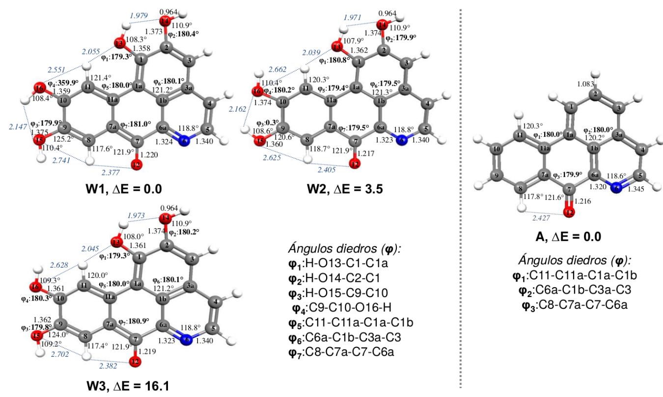 Se localizaron tres mínimos sobre la superficie de energía potencial del estado fundamental de OG sin grupos metilo empleando el funcional B3LYP y la base TZVP. La geometría de los mínimos de OG sin grupos metilo, sus parámetros geométricos y la numeración de los átomos utilizada se muestran en la Figura 4.