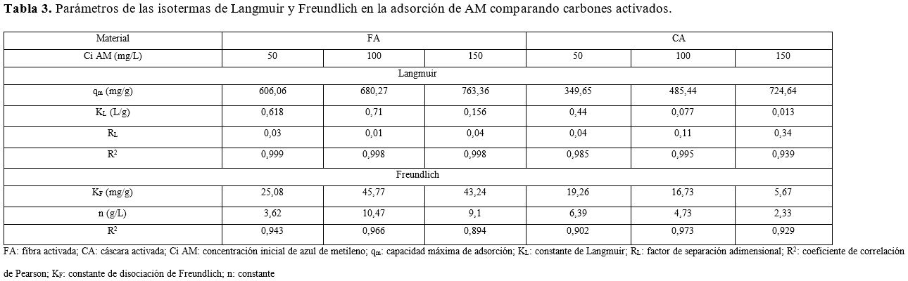 El factor de separación adimensional de las isotermas de Langmuir (RL) es un parámetro importante que indica si el proceso de adsorción es favorable (0 < RL < 1), lineal (RL = 1), desfavorable (RL > 1) o irreversible (RL = 0) (26). Los valores de RL a 50 mg/L y 150 mg/L como concentración inicial de AM están en el rango de 0,01 a 0,04 y de 0,04 a 0,34 para FA y CA, respectivamente. Lo anterior indica que el proceso de adsorción es favorable para el rango de concentraciones trabajadas usando los dos tipos de adsorbentes producidos.