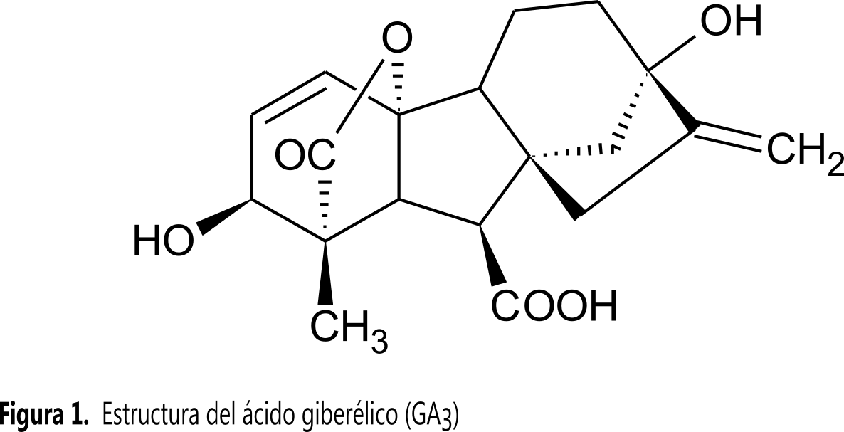 El ácido giberélico (GA3) (Figura 1) es una fitohormona que hace parte de la familia de los diterpenos tetracíclicos de naturaleza ácida ( 1 ). Este ejerce efectos diversos en el crecimiento y desarrollo de la planta, promueve la germinación de las semillas que se encuentran en estado de dormancia, la elongación del tallo, el brote de las yemas y el desarrollo de los frutos ( 2 , 3 ). La acción del GA3 en el crecimiento de los tejidos puede estar regulada por la modulación celular de sus concentraciones, por la habilidad de la célula para responder al estímulo de esta fitohormona, o por ambas ( 4 ).