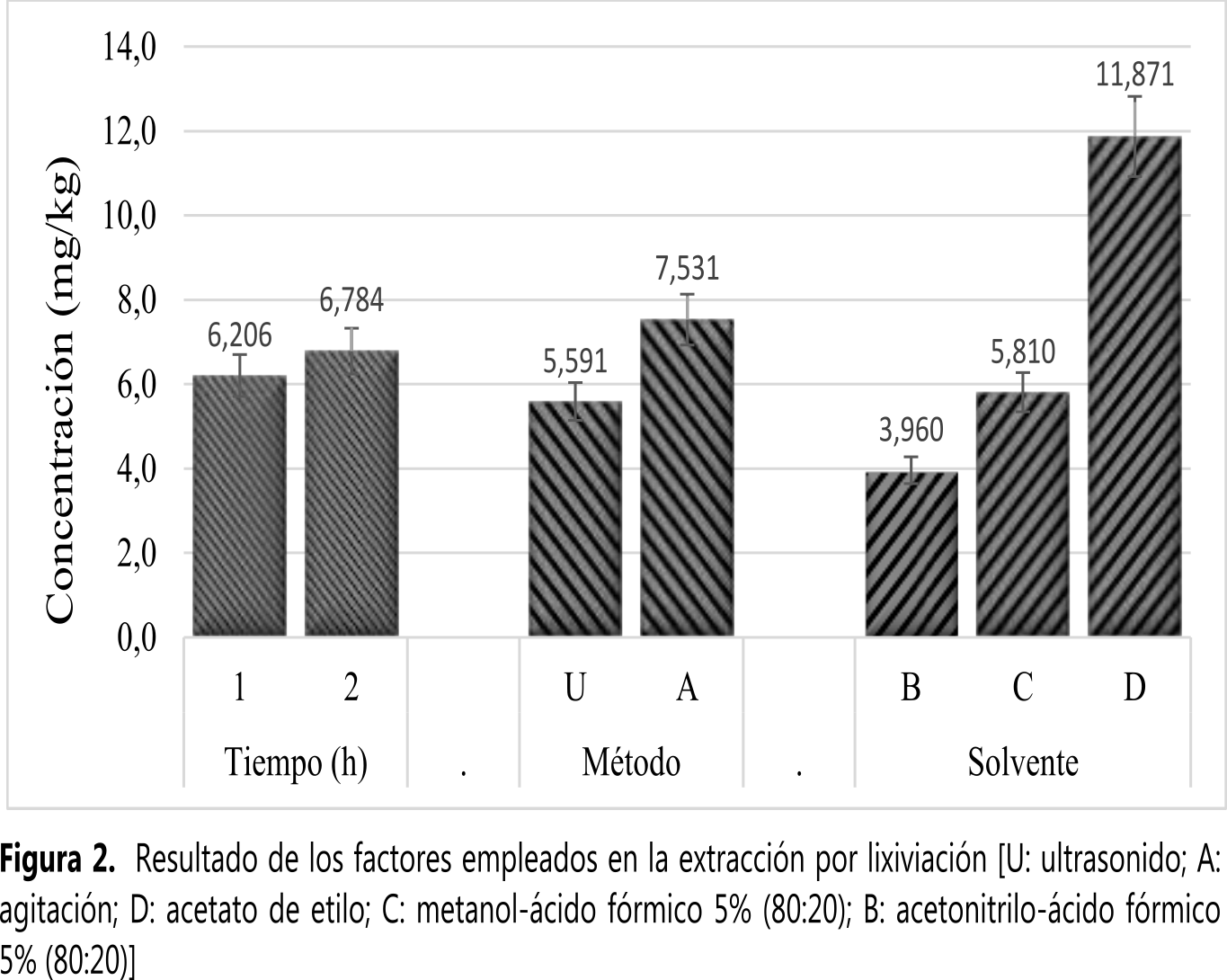 La optimización de los métodos de extracción por lixiviación y por DSASE se realizó mediante un ANOVA multifactorial, previa verificación de los supuestos (normalidad, homocedasticidad e independencia). Las diferencias estadísticas presentadas entre los tratamientos se analizaron mediante la prueba de rangos múltiples de Tukey. La comparación entre los métodos óptimos de extracción se realizó mediante la prueba t para diferencia de medias independientes con varianzas iguales, previa verificación de tal igualdad por el test F. Los análisis fueron realizados empleando el software Statgraphics centurión XI en modo demo.