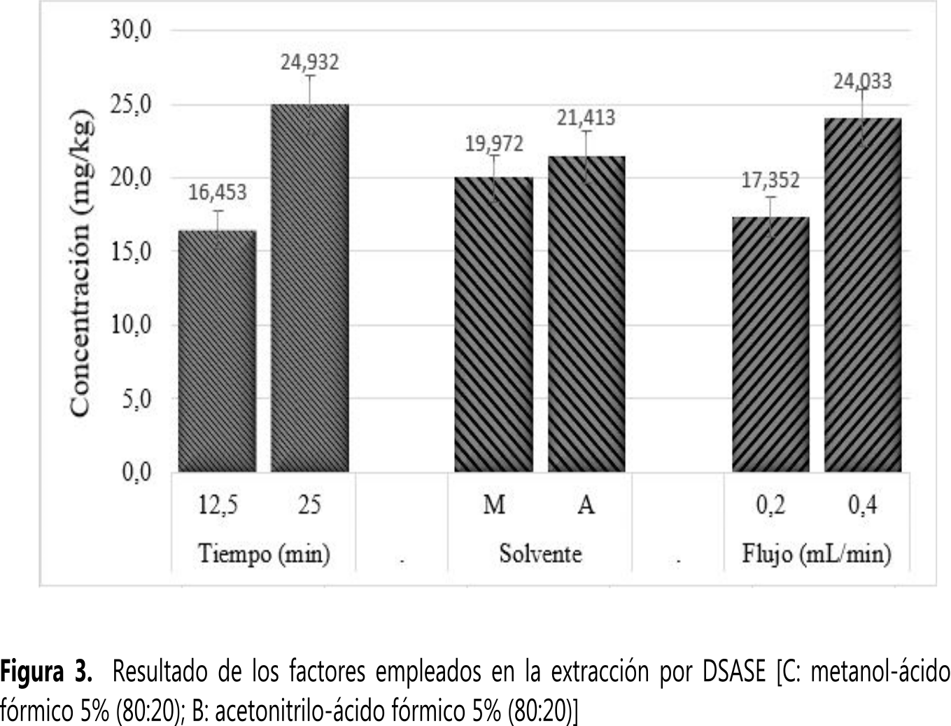 Para la extracción por DSASE, los factores flujo y tiempo tuvieron diferencias estadísticamente significativas, mientras que con el factor solvente no se presentaron diferencias estadísticamente considerables, con una significancia del 5% (Figura 3).