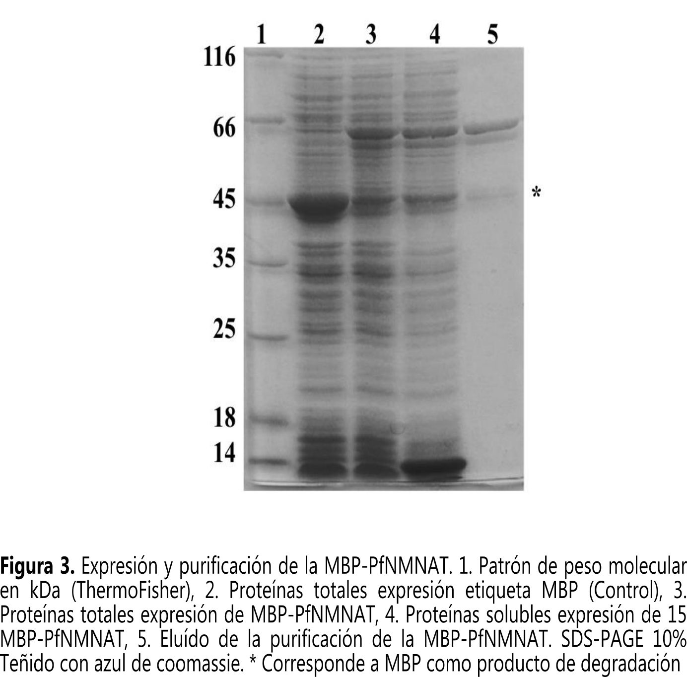 Se observó que, a partir de los lavados, se eliminó una gran cantidad de proteínas no unidas, permitiendo obtener eluídos con la proteína recombinante parcialmente pura y concentrada. Se presentó una pequeña contaminación por una proteína de aproximadamente 45 kDa correspondiente a un producto de degradación, debido a una alta tasa de degradación de la proteína recombinante PfNMNAT sobreexpresada, y el tamaño corresponde a la etiqueta (MBP) que por el contrario es muy estable.