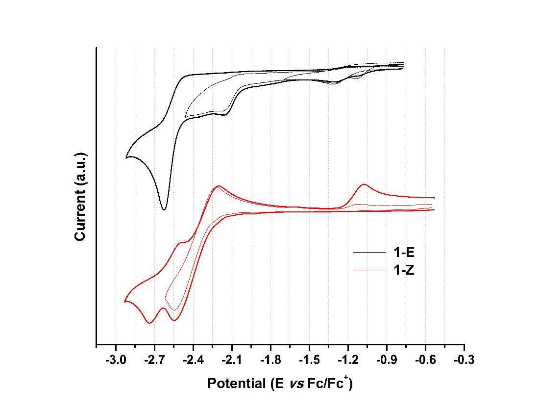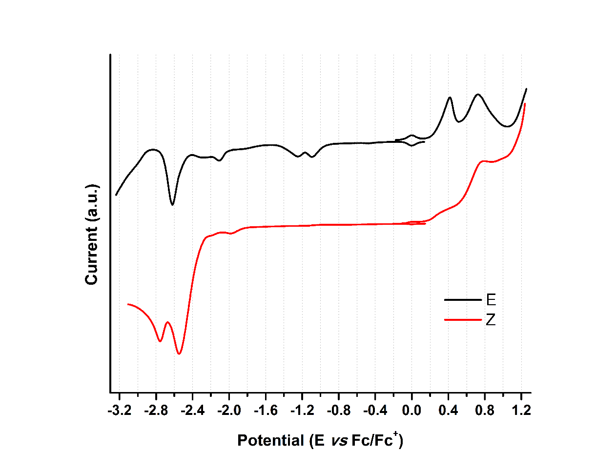 The electrochemical properties of compounds 1-E and 1-Z were studied by cyclic voltammetry (CV) and Osteryoung Square Wave Voltammetry (OSWV) (See Experimental Section).