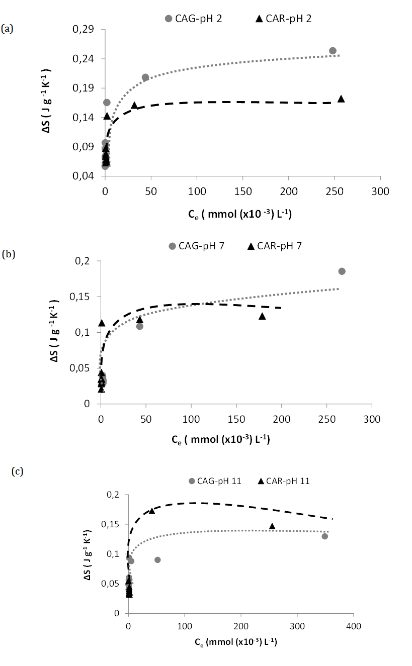 De acuerdo a los datos de la Figura 5, el cambio en la entropía disminuye con el aumento en el pH. Se atribuye este comportamiento a la disminución de interacciones en el sistema debido a que a pH 11 se presentan efectos repulsivos. En el caso de pH 7, el comportamiento es intermedio por la misma razón explicada para el carbón activado CAO. Así mismo, el cambio en la entropía es menor que a pH 2 debido a que hay menos especies en la solución y, por lo tanto, la variación de la entropía está asociada a la formación de interacciones con el adsorbente.