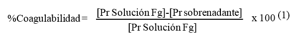 La funcionalidad del Fg purificado se determinó para cada muestra por triplicado. La actividad coagulante del Fg purificado se evaluó empleando el siguiente protocolo: en un tubo de borosilicato de 10 x 75 mm, se formó un coágulo de fibrina con 200 μL de solución de Fg purificado y 200 μL de solución trombina bovina-cloruro de calcio (trombina 1,25 U/mL y CaCl2 5 mM, concentración final). Se colocó un aplicador de madera en el tubo que contenía la solución de Fg y se dejó coagular a 37 °C por 30 min. Se recogió el coágulo y se determinó la concentración de proteínas, por el método de Lowry en la solución de Fg purificado y en el sobrenadante obtenido luego de remover el coágulo. El porcentaje de coagulabilidad se calculó mediante la siguiente ecuación (1) [20]: