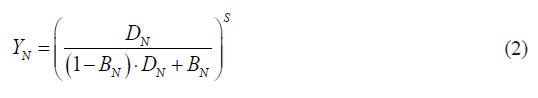 Donde, DN = Dp/D50 y YN = YB/Y50; DN: diámetro normalizado; YN: su correspondiente fracción normalizada; D50: mediana de la distribución acumulativa; Y50 = 0,5 (50% p/p) fracción de sólidos correspondiente a la mediana de la distribución; BN: coeficiente adimensional.
