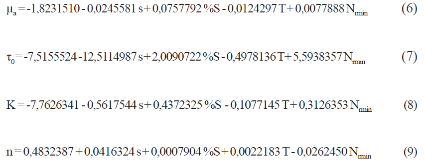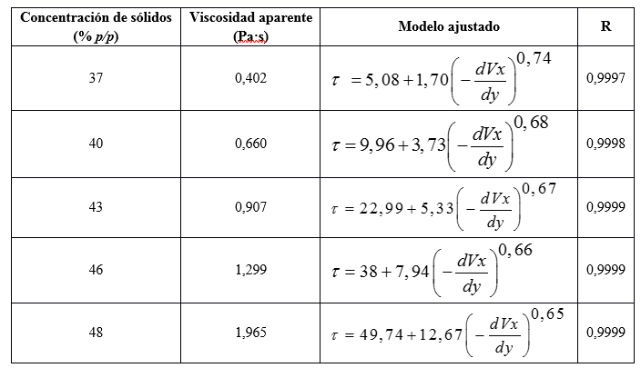 μa: viscosidad aparente de la suspensión (Y1i, Pa·s); t0: esfuerzo cortante inicial (Y2i, Pa); K: índice de consistencia (Y3i, Pa·s n) y n: índice de flujo (Y4i, adimensional).
