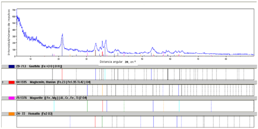 Las principales fases mineralógicas que constituyen las menas lateríticas son: Goethita que contiene del 58 al 78% del níquel presente en las lateritas [24] [25]. En la maghemita y magnetita se distribuye del 15 al 25% y en las asbolanas la presencia de níquel está entre 12 y 17%. El cobalto se distribuye del 80 al 90 % en las asbolanas, del 10 al 20% en la maghemita y magnetita, y en menor porcentaje en la goethita.