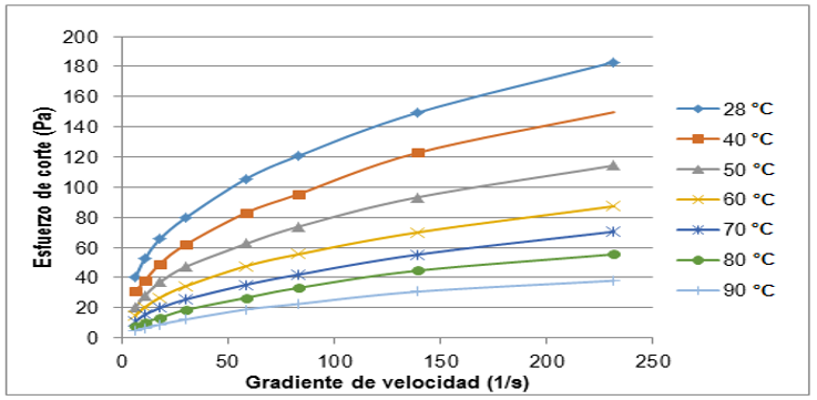 Para las mediciones reológicas se utilizó un viscosímetro rotacional marca HAAKE™ 550 (Thermo Fisher Scientific, USA). Con el viscosímetro se precalentó la pulpa, conectando una bomba de flujo para hacer recircular el agua a diferentes temperaturas. El viscosímetro tiene programadas diez velocidades diferentes y reporta los valores de gradiente de velocidad en 1/s, el esfuerzo cortante en Pa, la viscosidad en mPa·s y la temperatura en °C. Su rango de velocidad es 0,5-800 r/min con un error de ± 0,1 %.