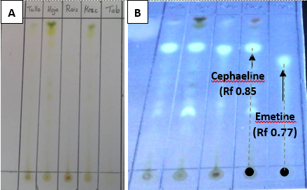 The formation of an orange precipitate upon addition of the Dragendorff reagent revealed the presence of alkaloids in root, stem and leaf samples. The presence of emetine and cephaeline in all parts of the P. ipecacuanha plant was confirmed by TLC. The compounds were identified making a comparison with the standards. This technique also allowed the separation of compounds of interest from other compounds present in the samples. The concentration of each compound was estimated based on the intensity of the spots (Figure 2).