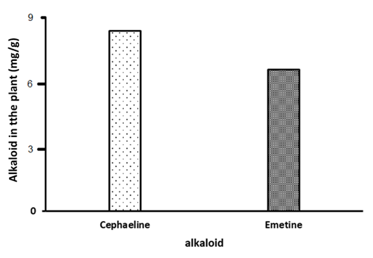 El objetivo de este estudio fue identificar los metabolitos eméticos en diferentes partes de P. ipecacuanha, una planta con propiedades eméticas. Se realizó un análisis fitoquímico parcial, donde se determinó la presencia de emetina y cefalina en hojas, tallos y raíces. Ambos alcaloides se detectaron en las tres partes de la planta analizadas. El mayor contenido de alcaloides se encontró en las raíces (8.55 mg/g), seguido de los tallos (4.05 mg /g), y el más bajo se encontró en las hojas (2.4 mg/g). El contenido de cefalina (8,35 mg/g) fue mayor que el de emetina (6,65 mg/g) en los tres órganos analizados. El análisis de toxicidad del extracto crudo mostró una DL50 de 500 mg/kg.