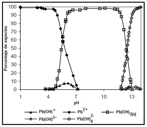 Por otra parte, el diagrama de especiación del plomo obtenido con la sal de Pb(NO3)2 [17], mostró el rango de pH con el que se iba a trabajar. En la Figura 1, se presenta el diagrama de especiación en el cual se observa que, a pH de 5,5, predomina el ion Pb2+; pero, a pH de 5, empieza a formarse el precipitado de hidróxido de plomo [Pb(OH)2 (s)] y la especie soluble Pb(OH)+. Con pH entre 12 y 13, las especies más comunes de hidróxido son el Pb(OH)4 2- y el Pb(OH)3 -. Con base en este diagrama de especiación, se optó por analizar la remoción del ion Pb(II) a pH de 3, 4 y 5.
