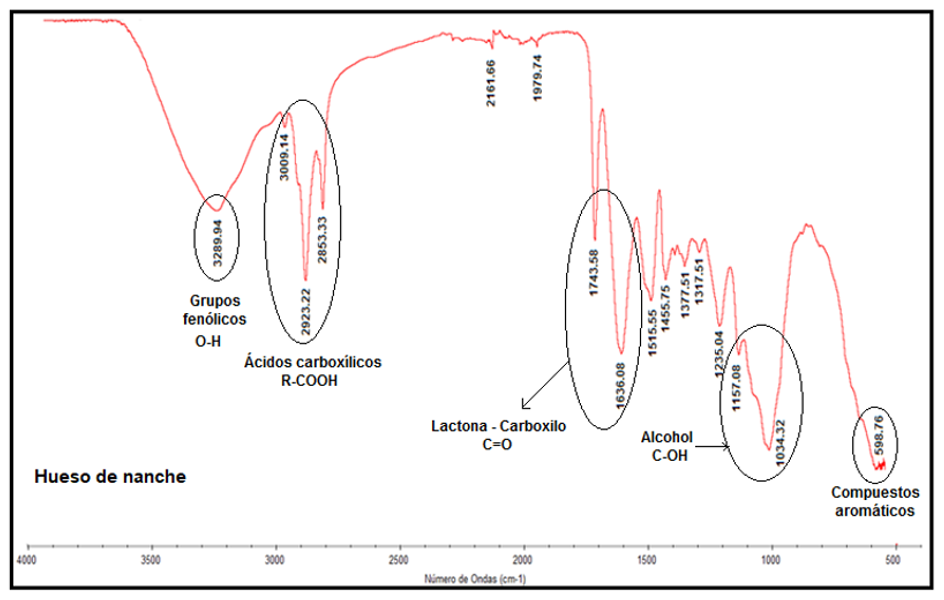 Para determinar los sitios funcionales en el hueso de nanche, se empleó la técnica de espectroscopía infrarroja (IR). Se obtuvieron espectros con un espectrómetro infrarrojo por transformada de Fourier (FTIR) marca Thermo Scientific, modelo Nicolete iS10 Smart iTR. Este equipo optimiza su radio de espectro en la región media de infrarrojo (4000-400 cm-1), utilizando el método de reflectancia atenuada [21]. Para llevar a cabo las mediciones, la muestra del HN en polvo se dispuso directamente sobre el cristal de detección del equipo [22,23].