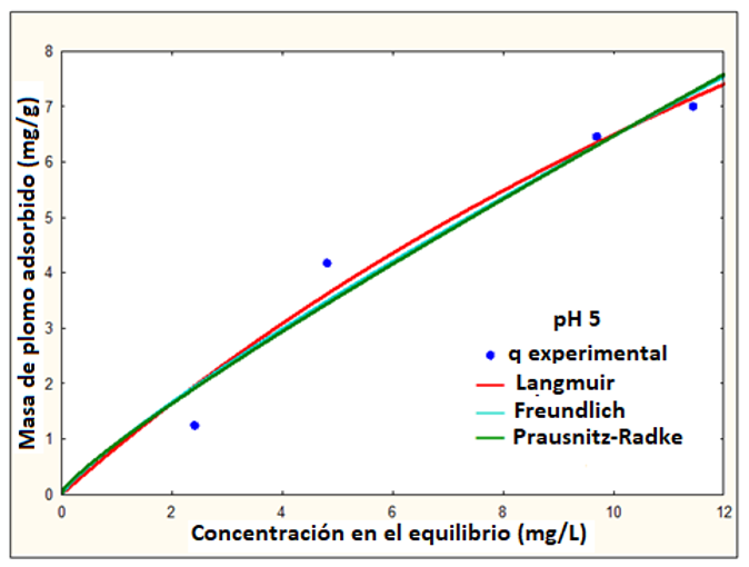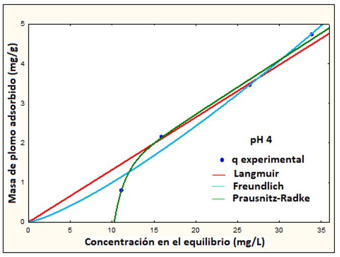 En la Tabla 2, se desglosan los resultados obtenidos de la masa adsorbida del ion Pb(II) por cada gramo de HN, representado a través de los modelos de Langmuir, Freundlich y Prausnitz-Radke.