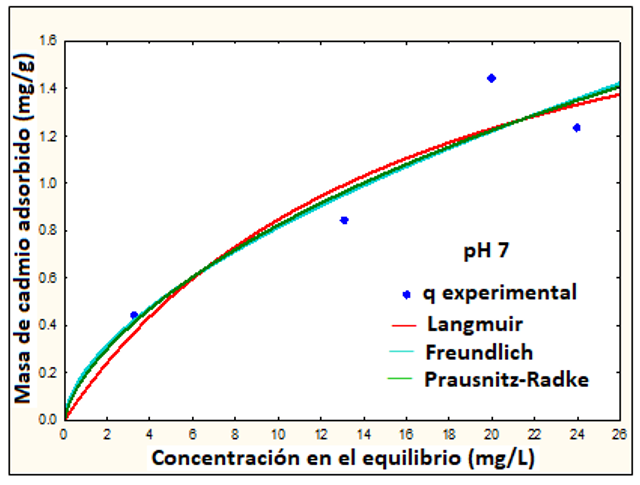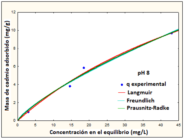 Los resultados indican un mejor ajuste de datos a los pH indicados en los modelos de Langmuir y Freundlich, según el porcentaje de desviación estándar (Tabla 4). A pH 8, el modelo de Prausnitz también se ajusta muy bien a los datos. Esto resultados están representados en la Figura 6 y 7, donde se grafica la concentración en el equilibrio (Ce), frente a la masa de cadmio adsorbido (q) a pH 7 y pH 8, respectivamente, con los 3 modelos descritos en la Tabla 4.