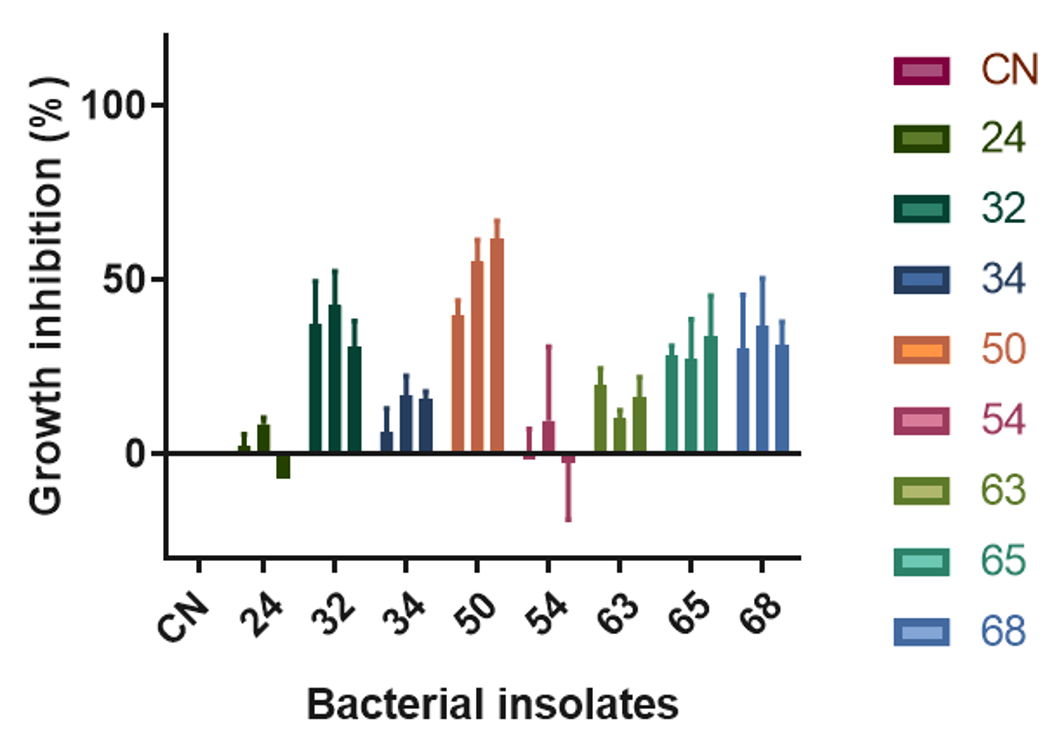 Marine microorganisms are a novel source of biologically active compounds which can influence the growth of pathogens [1]. Recently, metabolic profiles of selected strains of marine bacteria from the Colombian Caribbean Sea have been conducted in order to identify bacteria extracts with antibacterial effect, quorum quenching, and antifungal activity [2], with the aim of using them as phytopathogic biocontrol agents.