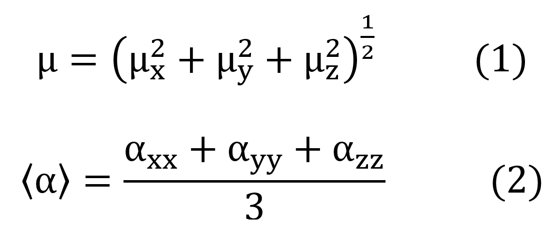 The total dipole moment and the average linear polarizability were calculated from the components x, y, and z, through the expressions: