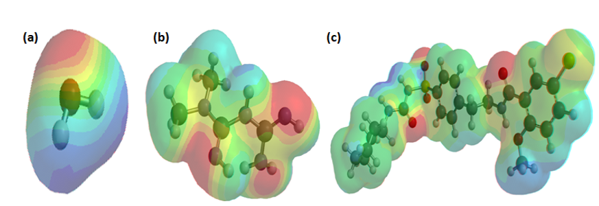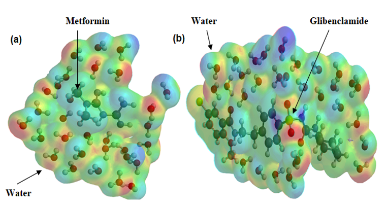 The MESP of the dissolution of both drugs in water are depicted in Figure 2. The electronic distribution shows that the regions of high electronic density were located in the OH, C=O and S=O bonds, while the regions of low electronic density were observed in the CH bonds. Figure 2(a) metformin shows an attraction between hydrogen in water and oxygen in the OH, while in Figure 2(b) it is observed that hydrogen bonds originate between hydrogen in water and the carbonyl group. This behavior corroborates the formation of a new bond that generates the dissolution of both drugs with water.