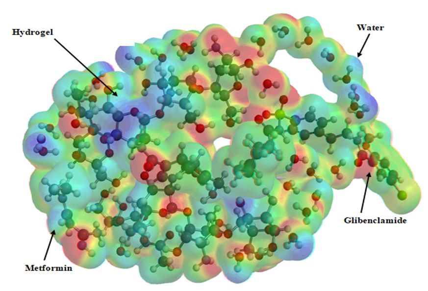 The computational analysis showed that there is a process of adsorption of metformine/glibenclamide complex using chitosan hydrogels due to the thermodynamic values as a Gibbs free energy of -2157.60 kcal/mol. The negative value of Gibbs free energy determined a spontaneous reaction which corresponded to the formation of hydrogen bonds. This was corroborated by the negative value of the coefficient partition (Log P) of -25.82, which indicated the hydrophilic capacity increases in the adsorption and the dipole moment change as a product of a greater electronegativity attributed to hydrogel.