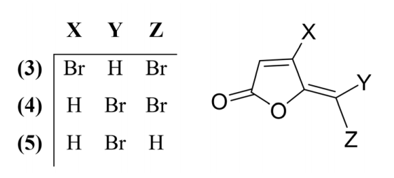 (Z)-4-bromo-5-(bromomethylene)-furan-2(5H)-one (3) [20]. White crystals: mp 82 - 83 °C; 1H NMR (CDCl3, 300 MHz) δ: 6.41 (1H, s, 5-CHBr), 6.50 (1H, s, H-3). HPLC purity of 99.9%.