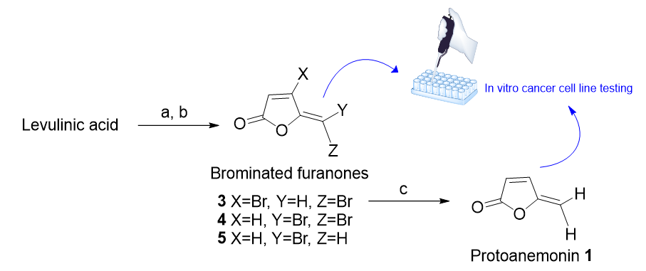 La protoanemonina, una furanona de origen natural, fue sintetizada a partir de la (Z)-4-bromo-5-(bromometilen)-furan-2(5H)-ona mediante una deshalogenación reductiva con zinc. La 5-(dibromometilen)-2(5H)-furanona y la (E)-5-(bromometilen)-2(5H)-furanona también fueron sintetizadas a partir del ácido levulínico mediante bromación y posterior ciclación promovida por ácido. Se investigó la actividad antiproliferativa de todos los compuestos sintetizados en las líneas celulares de cáncer humano PC-3 (próstata) y U-251 (glioblastoma). Los resultados demostraron que todas las furanonas obtenidas son más activas que el fármaco de referencia cisplatino, con un intervalo de CI50 de 0,31 ± 0,02 hasta 7,30 ± 0,08 μM. Sin embargo, la (E)-5-(bromometilen)-2(5H)-furanona, con un átomo de bromo en el doble enlace, demostró ser 25 veces más activa que el fármaco de referencia cisplatino.