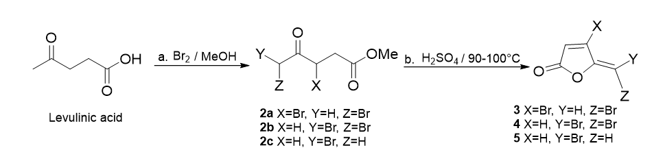 Thus, crude 2a/ 2b/ 2c mixture treated with sulfuric acid at 90-100 °C afforded bromo furanones (3), (4) and (5) in 41%, 12%, and 3% yield, respectively.